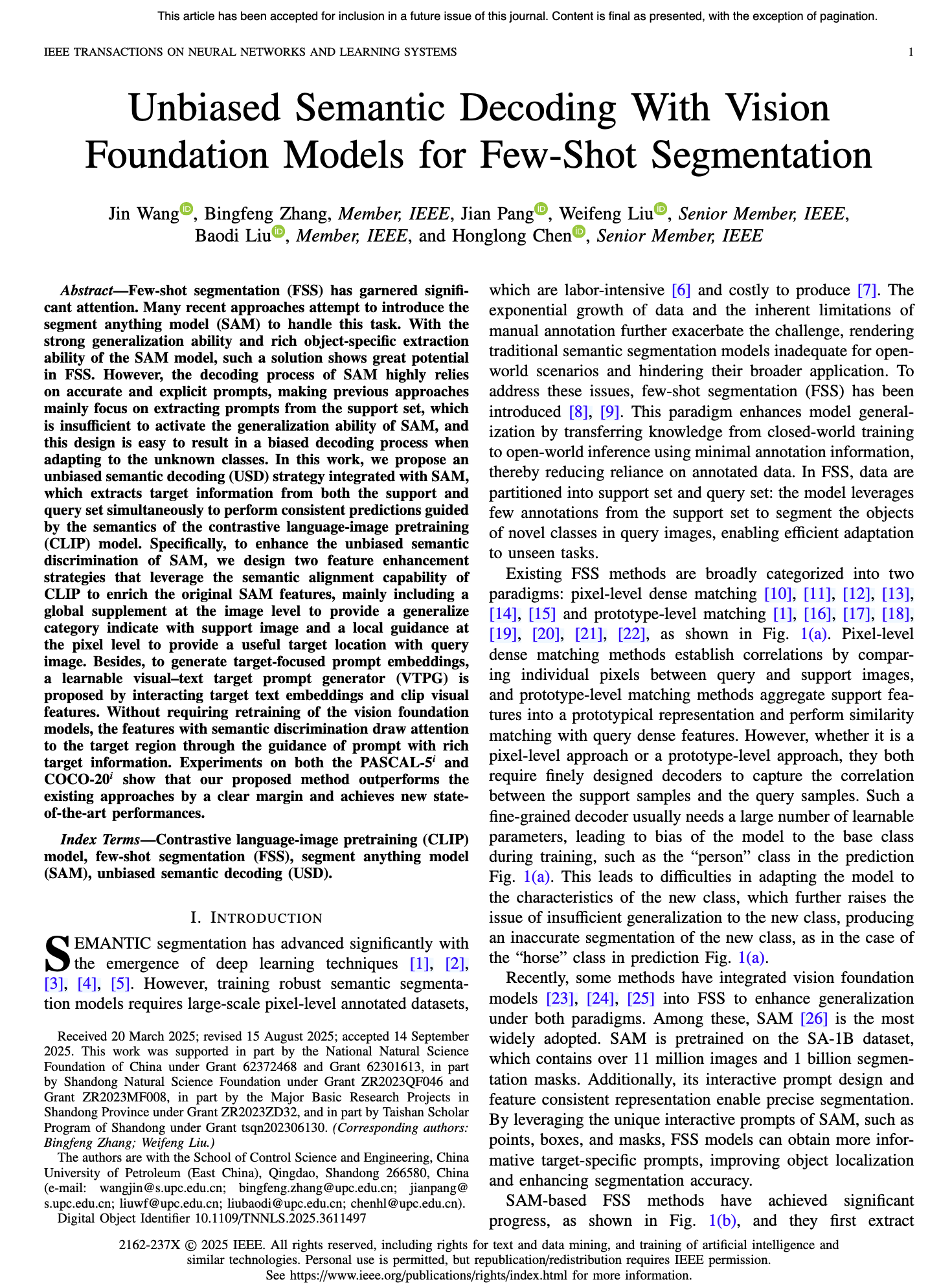 近日,我院控制科学与工程专业2023级博士研究生王进在小样本分割方面取得进展,相关研究成果Unbiased Semantic Decoding With Vision Foundation Models for Few-Shot Segmentation发表在《IEEE TRANSACTIONS ON NEURAL NETWORKS AND LEARNING SYSTEMS》。《IEEE TRANSACTIONS ON NEURAL NETWORKS AND LEARNING SYSTEMS》是人工智能领域的国际知名期刊,目前影响因子为8.9(SCI一区TOP)。论文第一作者为王进,通讯作者为刘伟锋教授、张冰峰副教授,太阳集团tyc234cc为唯一署名单位和通讯单位,该研究得到国家自然科学基金、山东省自然科学基金、山东省重大基础研究项目、山东省泰山学者计划项目的资助支持。