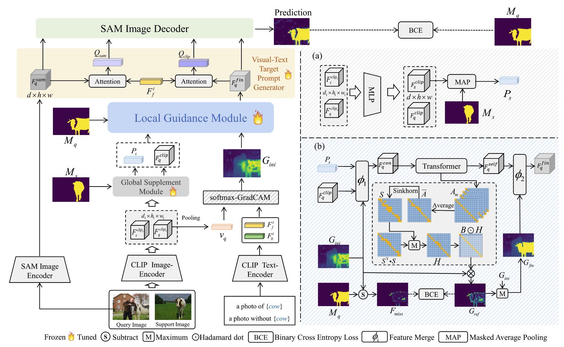 小样本分割(Few-shot Segmentation) 近年来受到了广泛关注。许多最新方法尝试将 Segment Anything Model(SAM) 引入该任务。得益于 SAM 强大的泛化能力与丰富的目标特征提取能力,这一思路在小样本分割中展现出巨大潜力。然而,SAM 的解码过程高度依赖于准确且显式的提示(prompt)。这使得现有方法大多专注于从支持集中提取提示信息,但这种方式无法充分激活 SAM 的泛化能力,并且在适应未知类别时容易导致解码偏差。为此,我们提出了一种与 SAM 相结合的无偏语义解码策略(Unbiased Semantic Decoding, USD)。该方法同时从支持集与查询集中提取目标信息,并借助 CLIP(Contrastive Language-Image Pre-training)模型的语义引导,实现一致的预测结果。具体而言,为增强 SAM 的无偏语义判别能力,我们设计了两种特征增强策略,利用 CLIP 的语义对齐能力来丰富原始的 SAM 特征,首先是全局增强(Global Supplement),在图像层面引入来自支持图像的类别指示信息,以提升模型的泛化能力;其次是局部引导(Local Guidance),在像素层面提供来自查询图像的目标位置信息,以强化局部目标关注。此外,我们还提出了一个可学习的视觉-文本目标提示生成器(Visual-Text Target Prompt Generator),通过目标文本嵌入与 CLIP 视觉特征的交互,生成以目标为中心的提示嵌入。该方法无需重新训练基础视觉模型,就能通过富含目标语义信息的提示,引导模型关注目标区域,从而提升分割效果。
