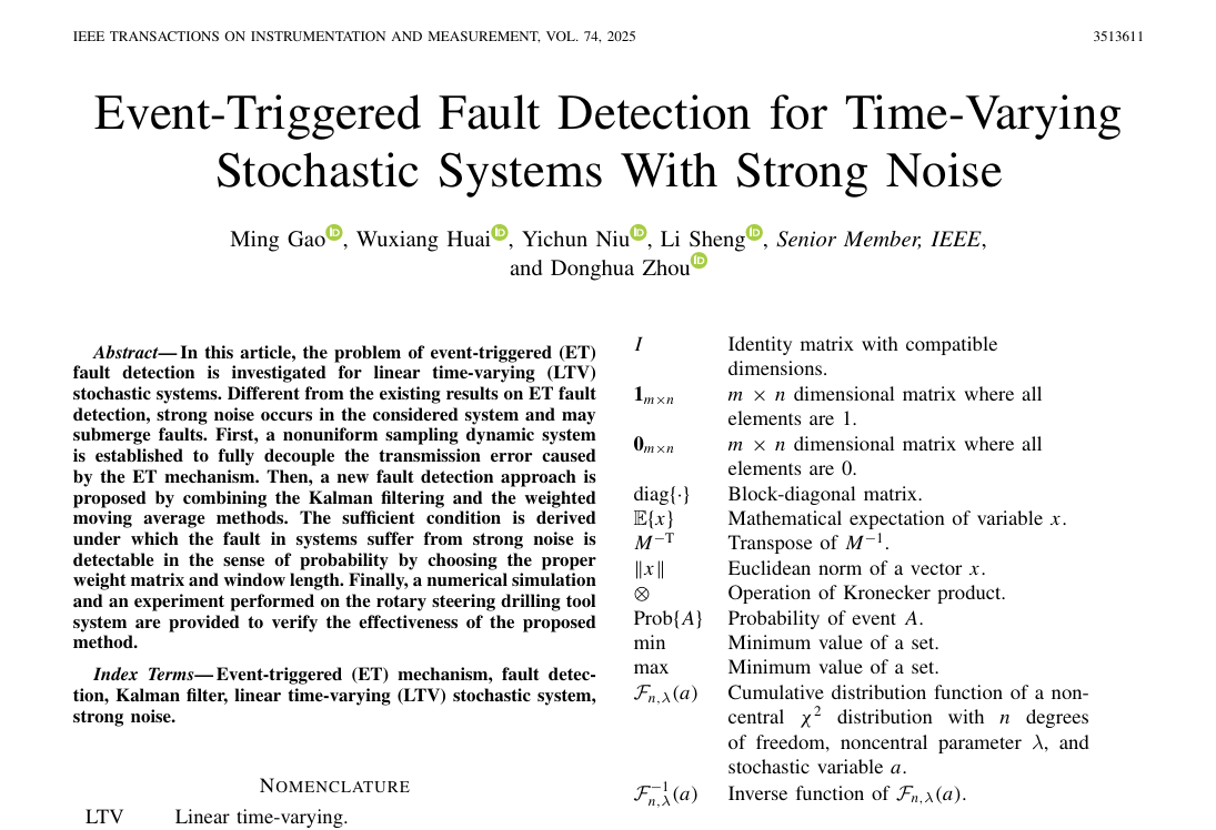 近日,我院控制科学与工程专业盛立教授团队的高明教授在强噪声下故障检测方面取得进展,相关研究成果Event-trigered fault detection for time-varying stochastic systems with strong noise发表在《lEEE Transactions on Instrumentation & Measurement》。《lEEE Transactions on Instrumentation & Measurement》是仪器仪表领域的国际知名期刊,目前影响因子为5.9(SCI二区)。论文第一作者为高明教授,博士研究生怀务祥为第二作者(导师一作),通讯作者为盛立教授,太阳集团tyc234cc为唯一署名单位和通讯单位,该研究得到国家自然科学基金、国家重点研发计划、山东省自然科学基金等项目的资助支持。
