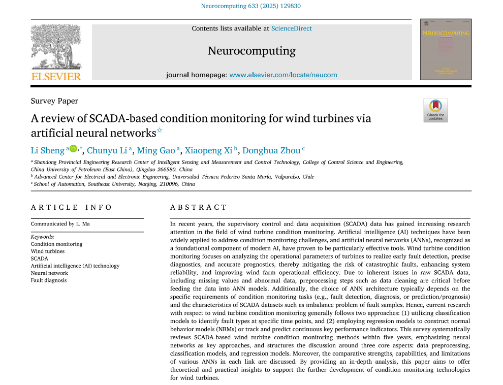 【成果】盛立教授团队在基于SCADA和神经网络的风力涡轮机状态监测综述方面取得进展