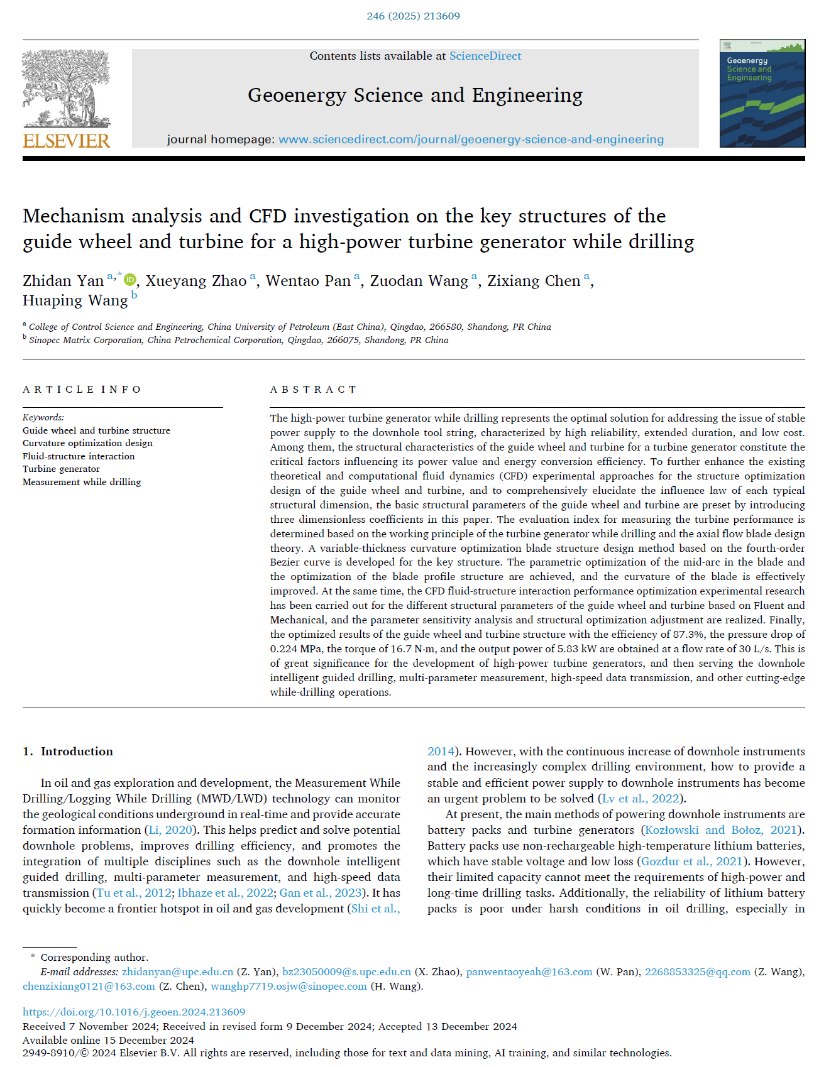 近日,太阳集团tyc234cc智能随钻测控技术与仪器课题组在随钻大功率井下涡轮发电机导轮与涡轮结构优化方面取得进展,相关研究成果《Mechanism Analysis and CFD Investigation on the Key Structures of the Guide Wheel and Turbine for a High-power Turbine Generator While Drilling》发表在《Geoenergy Science and Engineering》。《Geoenergy Science and Engineering》(原名为:Journal of Petroleum Science and Engineering)是石油工程领域的国际知名期刊,目前影响因子为4.6SCI二区TOP期刊)。论文第一作者为鄢志丹教授,第二作者为博士生赵雪阳,通讯作者为鄢志丹教授,太阳集团tyc234cc为第一署名单位和唯一通讯单位,该研究得到国家自然科学基金、山东省重点研发计划等多个项目的资助支持。