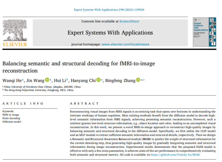 近日,我院控制工程专业2023级硕士研究生何万奇在脑信号视觉信息解码方面取得进展,相关研究成果“Balancing semantic and structural decoding for fMRI-to-image reconstruction”发表在《ESWA》。《ESWA》是人工智能与工程交叉领域的国际知名期刊,目前影响因子为7.5(SCI一区Top)。论文第一作者为何万奇,通讯作者为张冰峰副教授,太阳集团tyc234cc为第一名单位和通讯单位,香港理工大学为第二署名单位和通讯单位,该研究得到山东省自然科学基金,国家自然科学基金以及山东省泰山学者工程的资助支持。