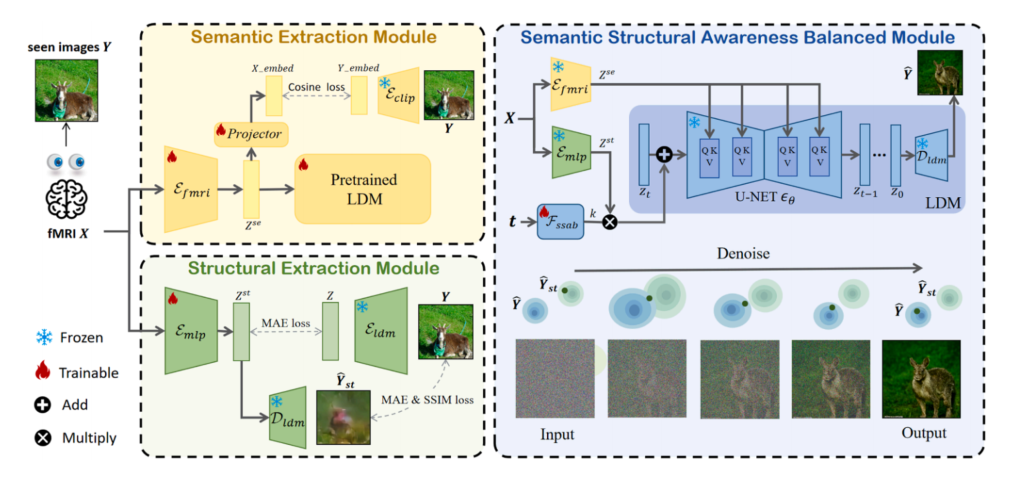 从功能性磁共振成像(fMRI)信号重建视觉图像是一项极具吸引力的研究课题,它为理解人类认知的复杂机制开辟了新视野。现有方法大多借助扩散模型从fMRI信号中解码高层次语义信息,取得了显著的语义重建效果。然而,这类解决方案往往忽视了物体位置、颜色等低层次结构信息,导致视觉重建效果不完整。本研究提出了一种创新的fMRI图像重建方法,通过在扩散模型中平衡语义解码与结构解码来实现高质量图像重建。具体而言,我们首先利用CLIP模型提取充分的语义信息,再通过MLP模块获取结构细节。随后设计了语义与结构感知平衡模块(SSAB),通过预测当前去噪步骤中结构信息的权重,逐步整合语义与结构信息,从而在图像重建过程中生成高质量图像。实验结果表明,所提出的SSAB模型仅需增加少量参数即可有效提升性能,在全面评估语义与结构指标时均达到行业领先水平。