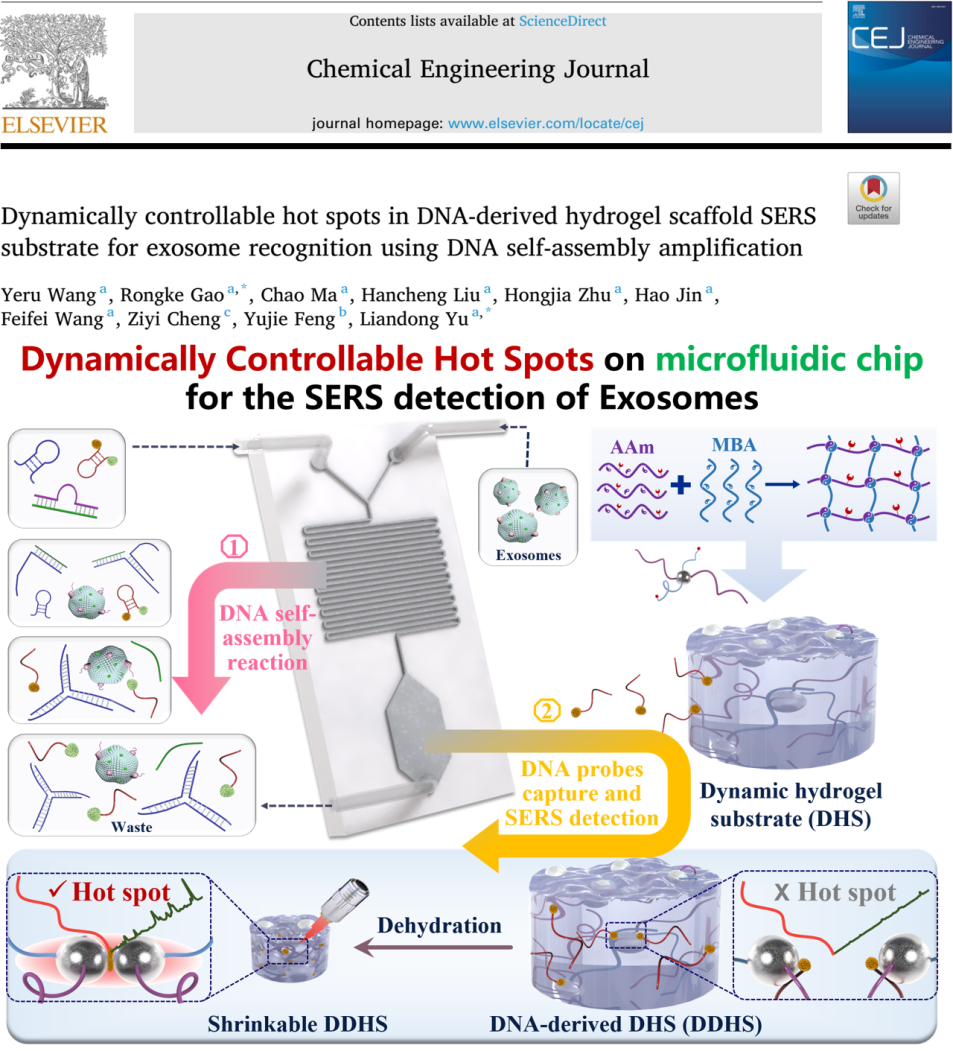 近日,我院控制学院与工程专业2021级博士研究生王业茹在水凝胶检测外泌体拉曼光谱方面取得进展,相关研究成果《Dynamically controllable hot spots in DNA-derived hydrogel scaffold SERS substrate for exosome recognition using DNA self-assembly amplification》发表在《Chemical Engineering Journal》。《Chemical Engineering Journal》是化学工程及相关领域领域的国际知名期刊,目前影响因子为13.2(SCI一区)。论文第一作者为王业茹,通讯作者为高荣科教授,太阳集团tyc234cc为唯一署名单位和通讯单位,该研究得到中国国家自然科学基金的资助支持。