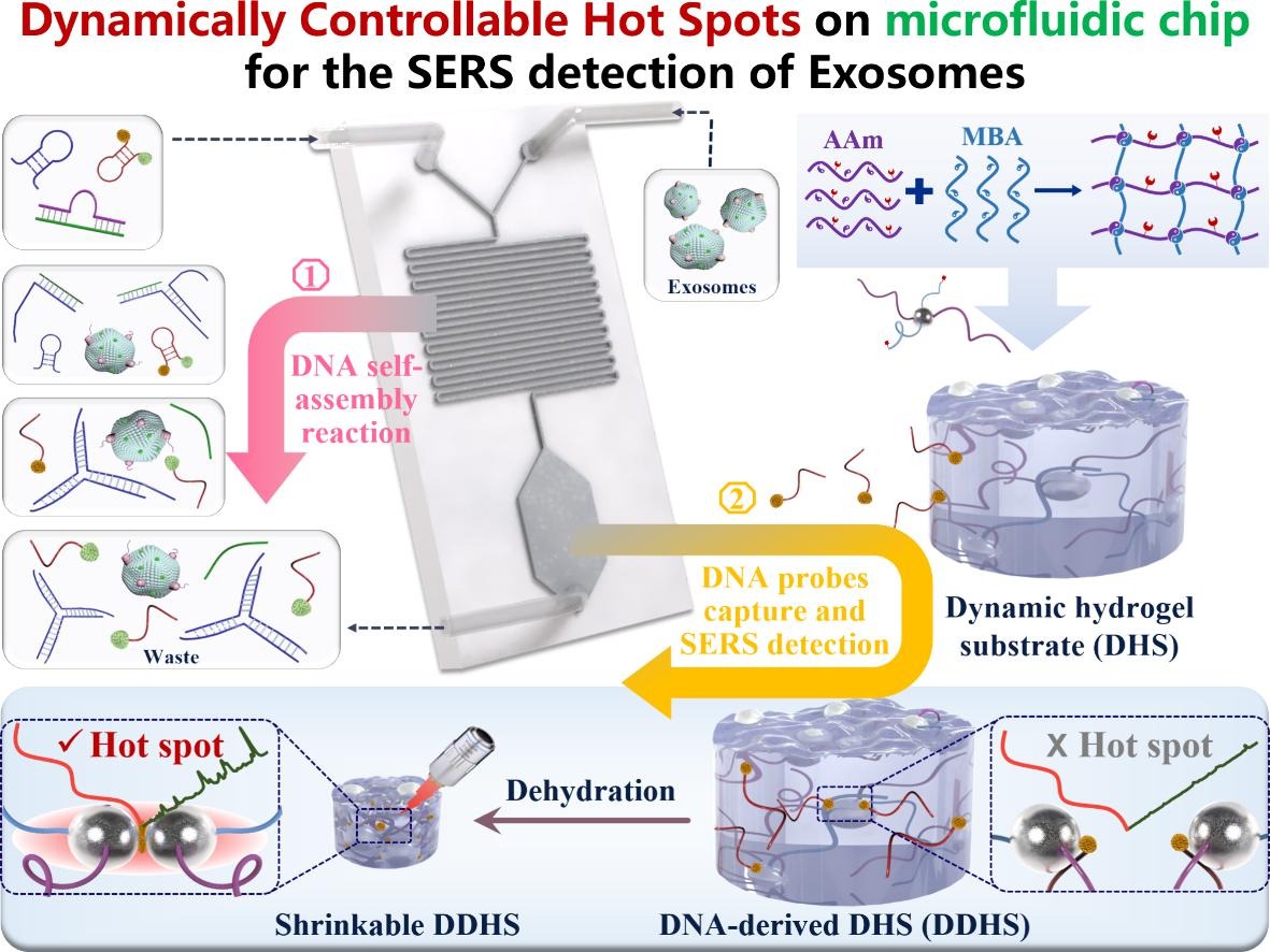 在表面增强拉曼散射(SERS)应用的背景下,有效的活性基底应该表现出高增强因子、长期稳定性和出色的可重复性,并允许目标分子以足够的数量和亲和力进入热点区域。热点中的电磁场可以被极大地放大,从而导致异常大的信号增强。然而,热点的不受控制的形成阻碍了这一意图的实现。在这里,我们报道了一种创新的SERS活性底物,称为DNA衍生的动态水凝胶支架(DDHS),它具有强大的电磁增强和卓越的靶亲和力。基于这种集成的微流控芯片,引入了合理设计的DNA寡核苷酸来识别外泌体指标CD63,达到2.63μL⁻¹的限度。综上所述,我们认为,所提出的策略将有可能加速SERS应用于肿瘤生物标志物的追踪检测,从而为癌症疾病的筛查测试和早期诊断提供一条有前景的途径。