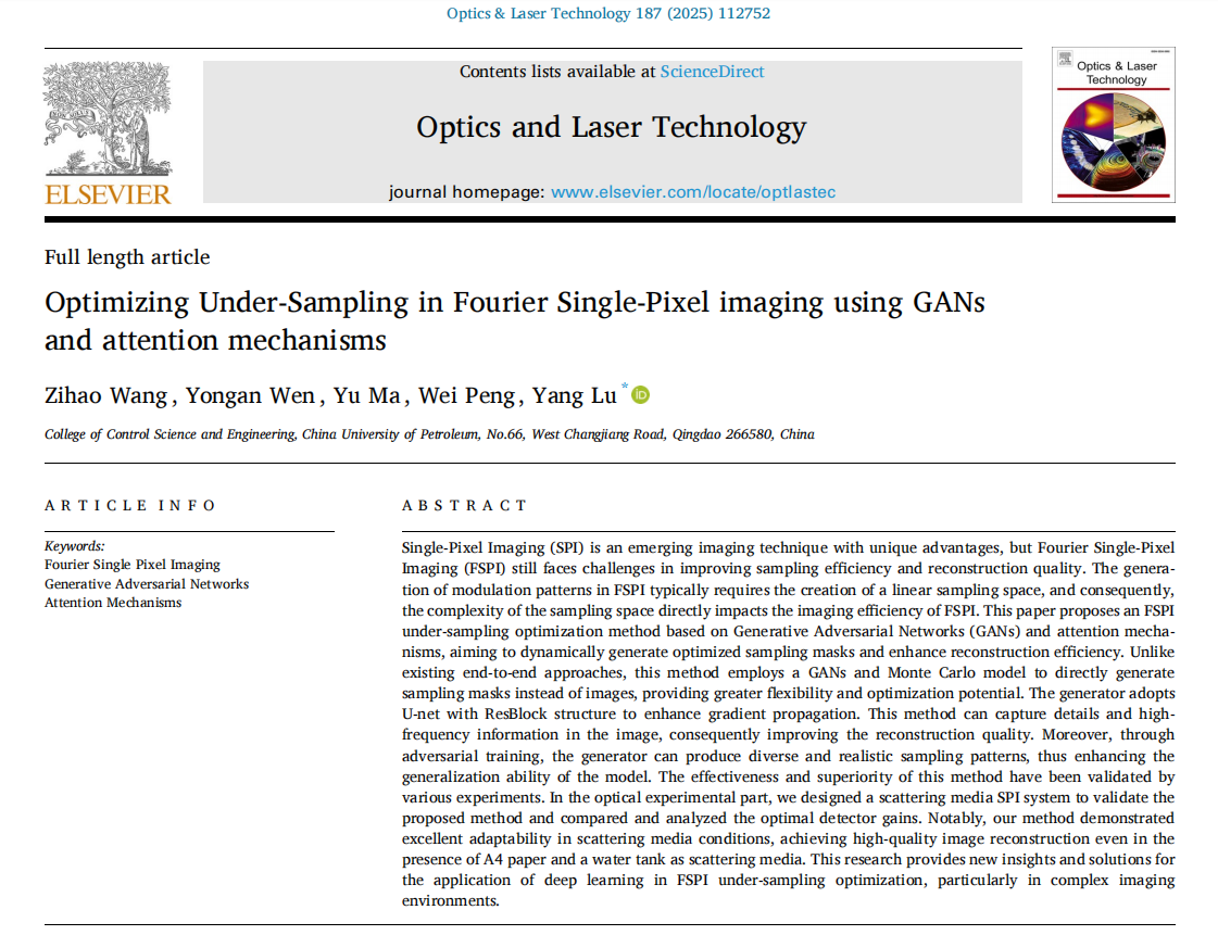 近日,我院控制科学与工程专业2021级博士研究生王子豪在傅里叶单像素成像方面取得进展,相关研究成果Optimizing Under-Sampling in Fourier Single-Pixel imaging using GANs and attention mechanisms发表在《Optics and Laser Technology》。《Optics and Laser Technology》是光学成像领域的国际知名期刊,目前影响因子为5.0(SCI二区top)。论文第一作者为王子豪,通讯作者为陆洋副教授,太阳集团tyc234cc为第一署名单位和通讯单位,该研究得到国家重点研发计划(项目编号:2024YFF0726500)、山东省重点研发计划(项目编号:2024ZLGX09)、中国科学技术协会青年精英科学家资助计划(目编号:2022QNRC001)、国家自然科学基金(项目编号:U22A20205)、山东省泰山学者特聘专家项目(项目编号:tstp20230614)的资助支持。
