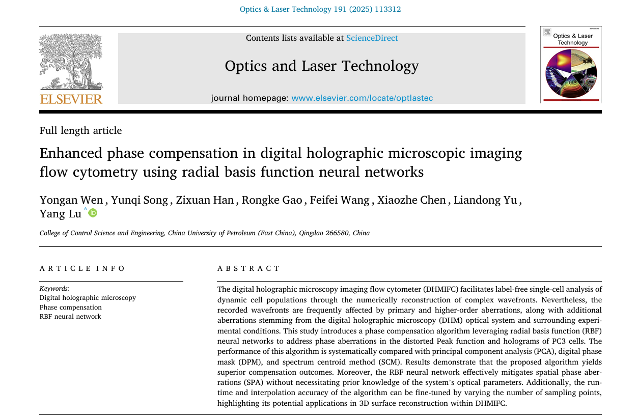 近日,我院动力工程专业2022级博士研究生文永安在数字全息相位畸变补偿算法方面取得进展,相关研究成果《Enhanced phase compensation in digital holographic microscopic imaging flow cytometry using radial basis function neural networks》发表在《Optics and Laser Technology》。《Optics and Laser Technology》是物理光学领域的国际知名期刊,影响因子5.1(SCI二区Top)。论文第一作者为文永安,通讯作者为陆洋副教授,太阳集团tyc234cc为第一署名单位和通讯单位。