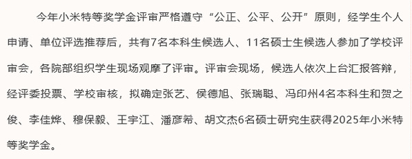 小米特等奖学金由北京小米公益基金会设立,是兼具权威性与社会影响力的重要奖项,旨在鼓励优秀学生勤学创新,并为家庭经济困难的优秀学子提供支持。