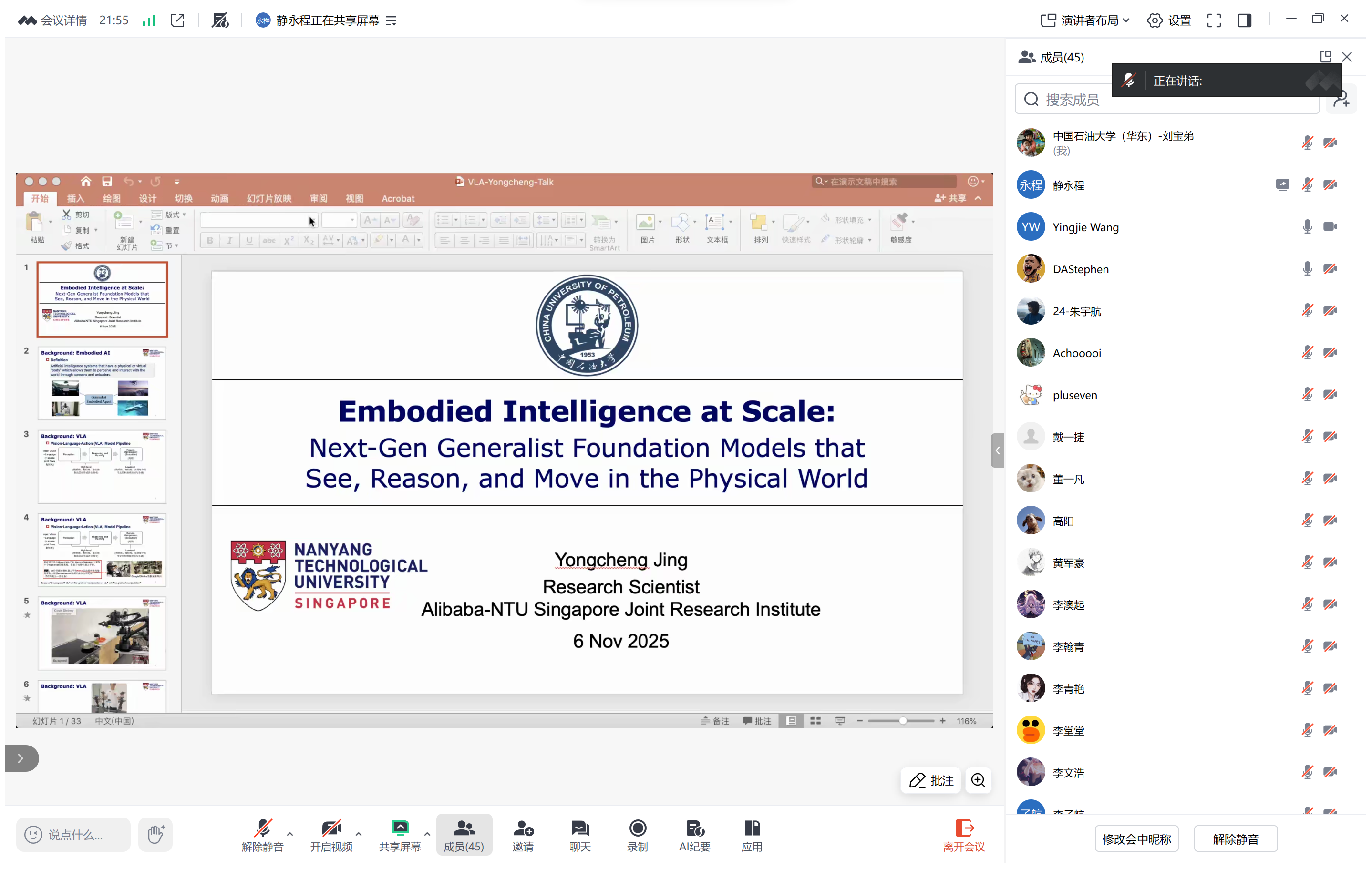2025年11月6日晚,太阳集团tyc234cc太阳集团tyc234cc成功举办“具身智能”主题线上学术报告。本次讲座特邀新加坡南洋理工大学研究科学家静永程博士,围绕“具身智能规模化发展:下一代通用基础模型在物理世界中的感知、推理与行动”展开深入讲解,吸引了学院广大师生在线参与。
