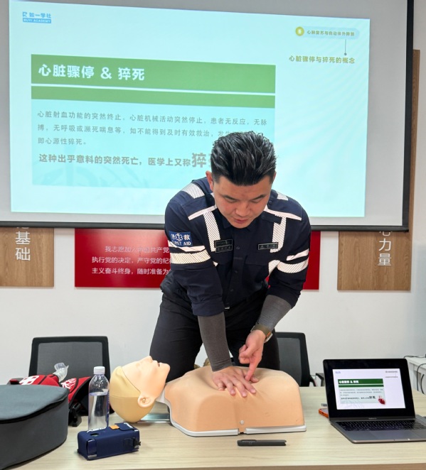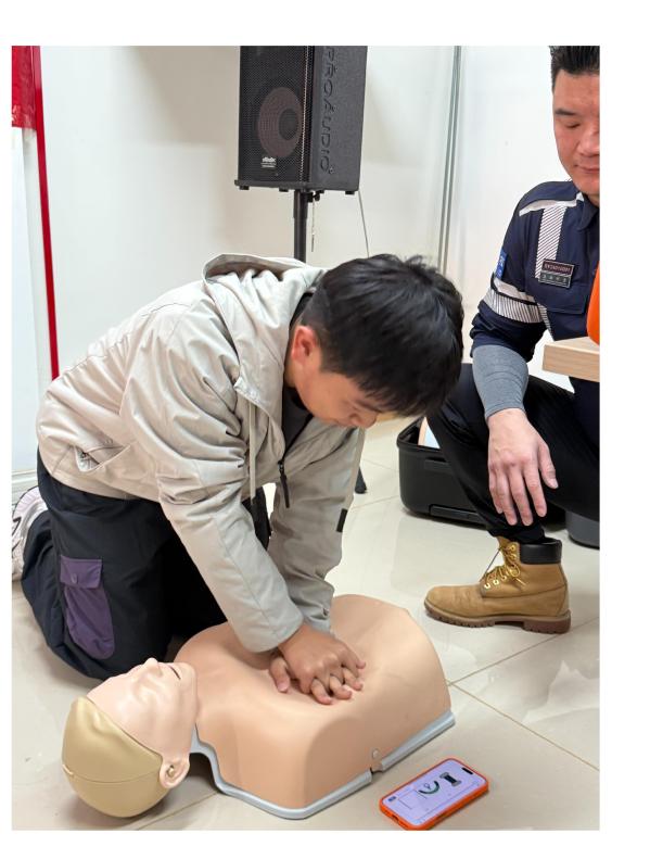 活动进行时,专业讲师张恩华以“黄金四分钟”为切入点,结合真实案例阐明了急救的重要性。随后,张老师分模块讲解核心技能:从海姆利克急救法的法力位置与节奏,到心肺复苏的按压深度、频率与人工呼吸的配合要点,再到AED设备的开机、电极片粘贴及操作流程,均进行了细致拆解。他强调:“急救技能是生命的兜底保障,规范操作才能发挥作用。”