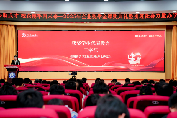 会上,“小米特等奖学金”获得者、我院2023级硕士研究生王宇江代表全体获奖学生作典型发言。研究生期间,她深耕化工过程可解释性故障诊断研究,成果显著。在发言中,她回顾了自己在科研、学生工作、科创比赛、文体活动中的宝贵经历,表达自己从一个“受助者”到“助人者”角色转变过程中的心路历程。她说:“我将牢记石大精神,以获奖为新起点深耕专业,勇担能源报国使命,为中华民族的伟大复兴贡献青春力量”。