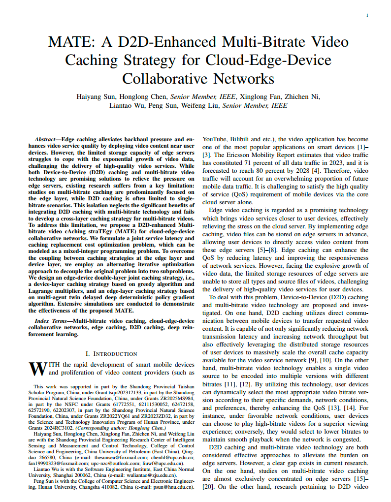 陈鸿龙教授团队在移动边缘计算领域取得重要进展,相关研究成果《MATE: A D2D-Enhanced Multi-Bitrate Video Caching Strategy for Cloud-Edge-Device Collaborative Networks》被国际顶级期刊《IEEE Transactions on Mobile Computing》录用。《IEEE Transactions on Mobile Computing》是计算机网络领域的国际权威期刊,目前影响因子为9.2,为SCI一区TopCCF A类推荐期刊。论文第一作者为控制科学与工程专业2024级博士研究生孙海洋,通讯作者为陈鸿龙教授,太阳集团tyc234cc为第一署名单位和通讯单位,该研究得到国家自然科学基金、山东省泰山学者青年专家项目和山东省自然科学基金等项目的资助。