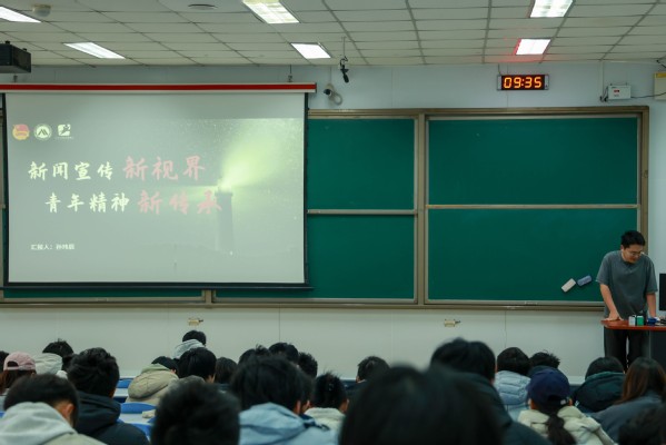 最后,辅导员孙玮辰围绕新闻宣传工作展开分享,他首先带领学生辨别私域流量和公域流量,提出舆论的重要性。孙玮辰强调流量是把双刃剑,同学们应在光怪陆离的网络场中,擦亮明眼辨是非,用理性破局守底线。团课末尾,孙玮辰以五四运动时期的《新青年》报为例,寄语全体同学,要将个人成长融入时代发展浪潮,学会用自媒体发声,讲好青年故事,引领时代思想。