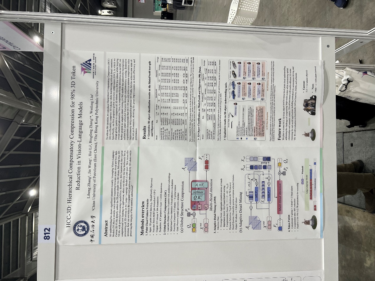 我院青年教师张冰峰副教授与2024级硕士生张立恒参加此次会议。我院青年教师张冰峰在会议上展示了题为《HCC-3D: Hierarchical Compensatory Compression for 98% 3D Token Reduction in Vision-Language Models》的研究工作,针对3D视觉大语言模型计算开销大、传统压缩易致性能衰减的问题,提出层次化补偿压缩双路径架构,实现约98%的3D Token压缩率,在降低训练推理成本的同时保持高质量性能,为技术工程化落地提供高效解决方案。