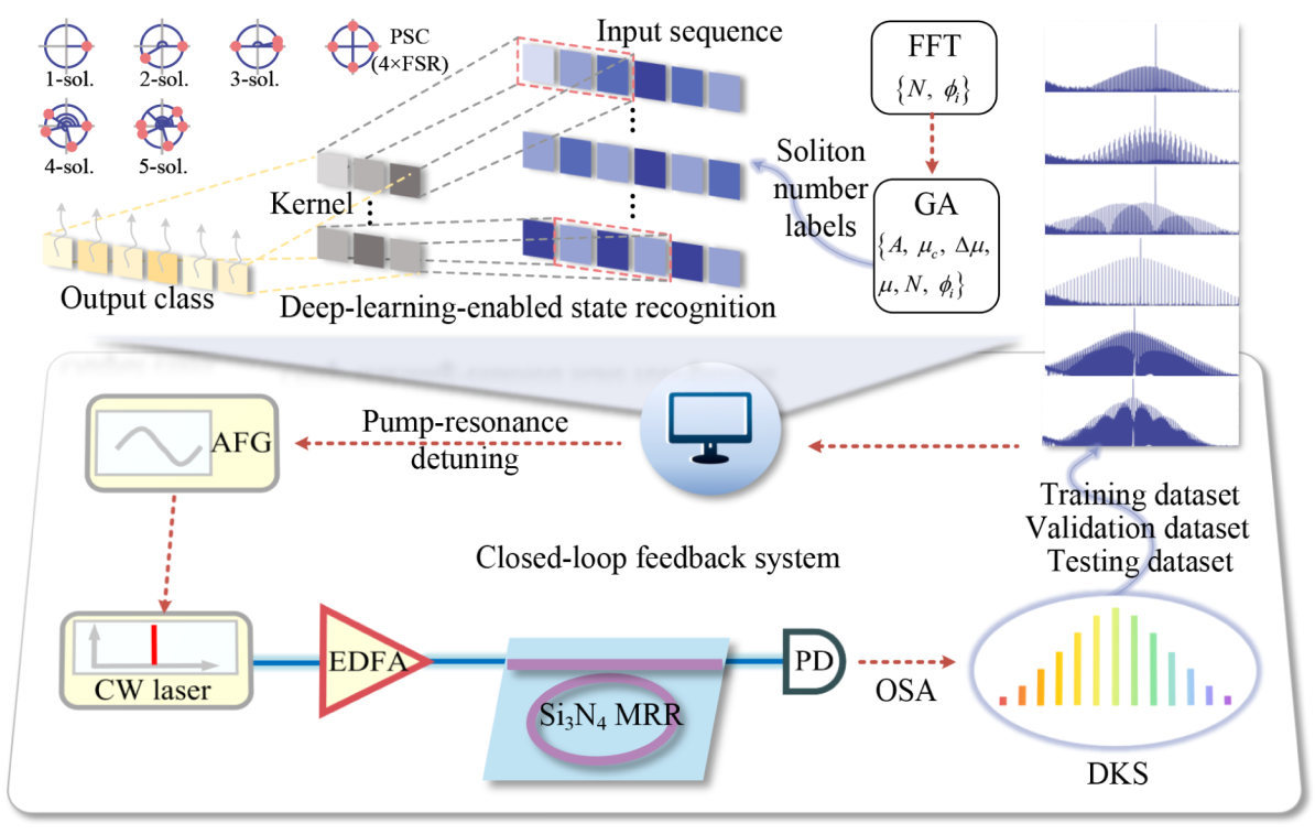 【本站讯】片上集成微腔光频梳凭借其高重频、倍频程带宽和芯片级集成优势,在相干光通信、精密光谱学、激光雷达及微波光子学等领域展现出巨大潜力。然而,微腔光频梳的可靠部署面临两大挑战:一是如何在芯片级微腔中实现热稳定的耗散克尔孤子(DKS)生成;二是传统启发式辨别与傅里叶分析(FFT)方法在DKS状态识别中耗时费力、难以扩展,且对噪声高度敏感。为此,我校于连栋教授团队联合韩国科学技术院(KAIST)Min-Kyo Seo教授团队与深圳国际量子研究院刘骏秋研究员团队,面向片上集成氮化硅微环腔中DKS的稳定激发与状态识别,提出了一种结合相位调制边带方法和CNN-TMHA模型的智能化系统,实现了对DKS的实时稳健、高精度的长期生成和自动分类。