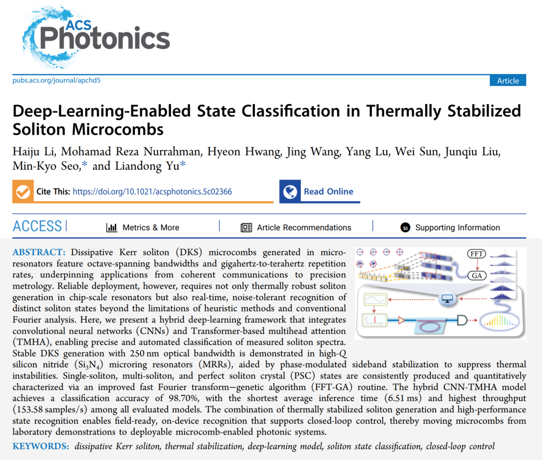 相关成果以“Deep-Learning-Enabled State Classification in Thermally Stabilized Soliton Microcombs”为题,发表于《ACS Photonics》。博士生李海菊为第一作者,太阳集团tyc234cc于连栋教授和韩国科学技术院(KAIST)Min-Kyo Seo教授为通讯作者,太阳集团tyc234cc为第一署名单位。该研究得到国家自然科学基金、国家重点研发计划项目、韩国国家科研基金等项目的联合资助。