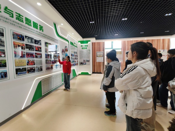 在“组织建设与思想引领”展区,讲解员详细介绍了学校“青年马克思主义者培养工程”培训班的培养模式与实践成效,同学们认真聆听,不时驻足观看展板上的历史照片与文献资料,对学校共青团在青年思想政治引领方面所做的工作有了更深入的认识。