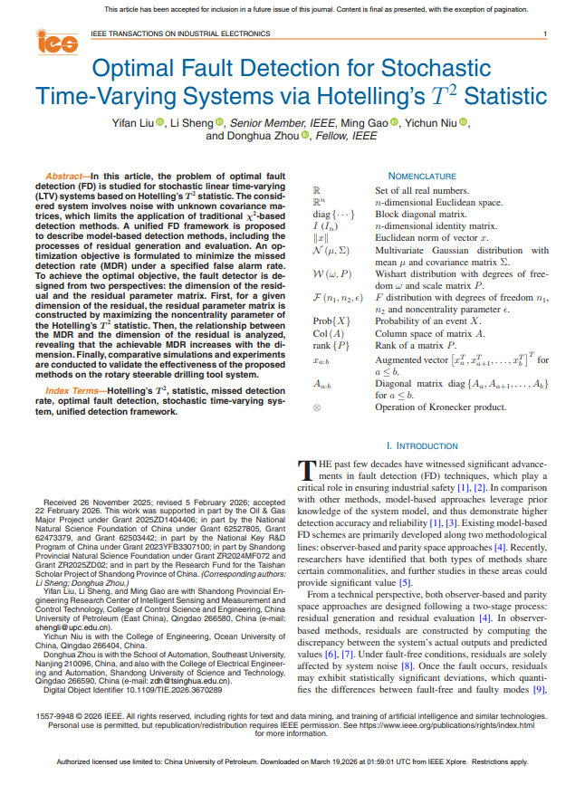Y. Liu, L. Sheng*, M. Gao, Y. Niu, D. Zhou*. Optimal fault detection for stochastic time-varying systems via Hotelling's T2 statistic. IEEE Transactions on Industrial Electronics, doi: 10.1109/TIE.2026.3670289. (https://ieeexplore.ieee.org/document/11430657)