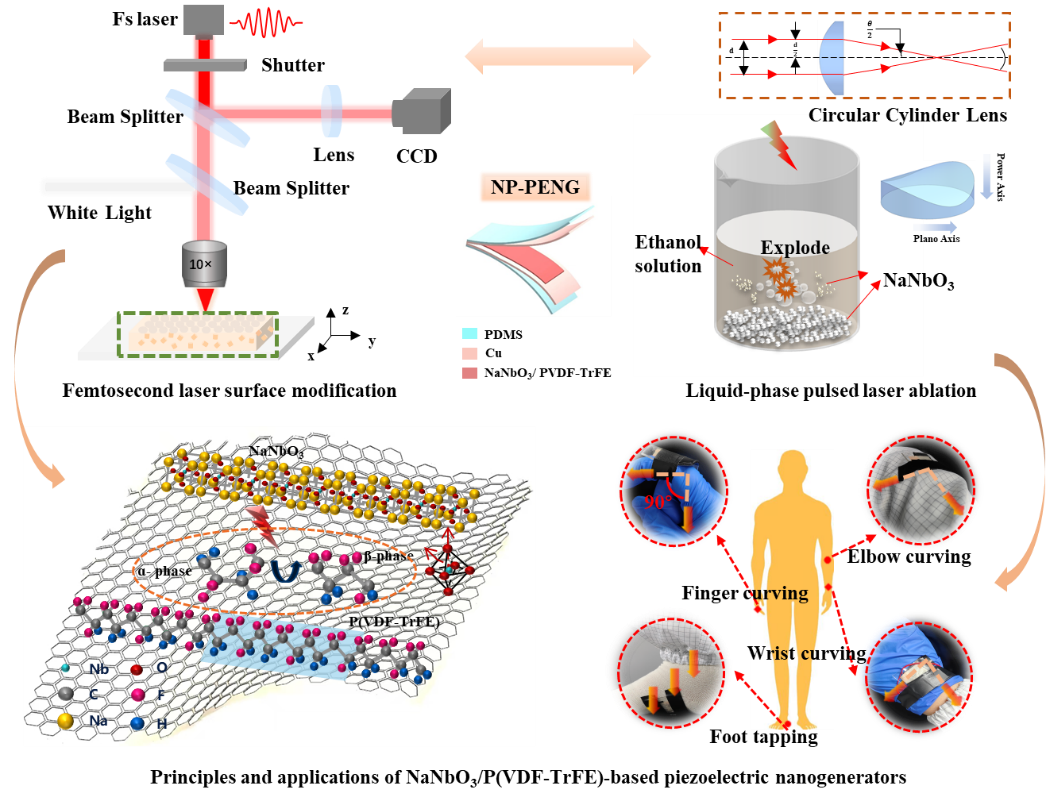 物联网技术(IoT)的广泛应用促进了电子设备的小型化和智能化发展,同时也给微能量的有效采集和自供电设备优化带来了重大挑战。在此,团队提出基于飞秒激光表面改性制备NaNbO3/P(VDF-TrFE)基压电纳米发电机(NP-PENG)用于生物能量采集和人体运动监测。在本研究中,我们通过液相脉冲激光烧蚀方法合成NaNbO3纳米颗粒,利用飞秒激光表面改性处理改变P(VDF-TrFE)基复合材料相结构,进而建立纳米颗粒填充与激光精密控制的协同系统,实现从晶相演变、精密调控到结构稳定三个维度的β相含量提高。经过飞秒激光处理后,柔性P(VDF-TrFE)基和含5 wt % NaNbO3/P(VDF-TrFE)基NP-PENG的输出潜力分别可达到26.1 V(提高36%)和40 V(提高52%)。此外,NP-PENG在循环机械应力下表现出极好的稳定性,可持续3000秒,并成功点亮20个LED灯。通过将NP-PENG附着在人体的不同部位,不仅可以精确感知人体运动状态,还能实时监测输出电压的变化。本研究提出的飞秒激光加工与纳米填料工程的协同耦合,显著提升NP-PENG输出性能,为研发兼具高能量转换效率与优异机械耐久性的柔性压电传感器件提供了可扩展方案,也为下一代智能运动监测和人机界面系统开辟了新的可能性。
