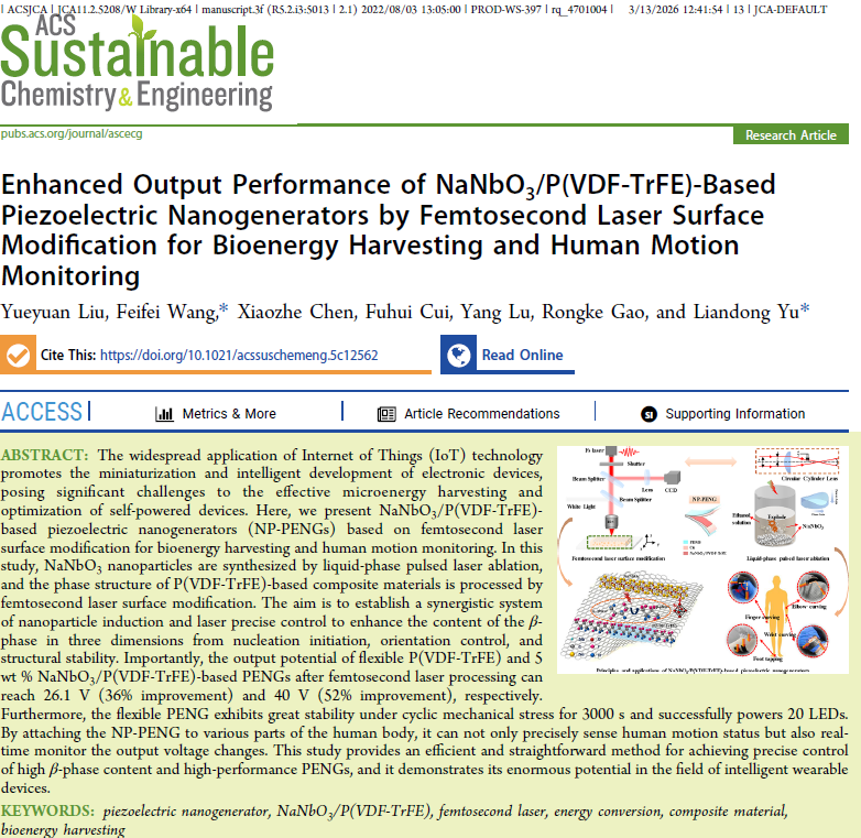 近日,我院于连栋教授团队在飞秒激光微纳加工柔性压电传感器件方面取得进展,相关研究成果《Enhanced Output Performance of NaNbO3/P(VDF-TrFE)-Based Piezoelectric Nanogenerators by Femtosecond Laser Surface Modification for Bioenergy Harvesting and Human Motion Monitoring》发表在《ACS Sustainable Chemistry & Engineering》。《ACS Sustainable Chemistry & Engineering》是化学领域的国际知名期刊,影响因子为7.3(SCI一区Top)。论文第一作者为精密测量与测控仪器专业2023级博士研究生刘月圆,通讯作者为于连栋教授和王飞飞副教授,太阳集团tyc234cc为唯一署名单位和通讯单位。该研究得到国家自然科学基金和国家重点研发计划项目的联合资助。