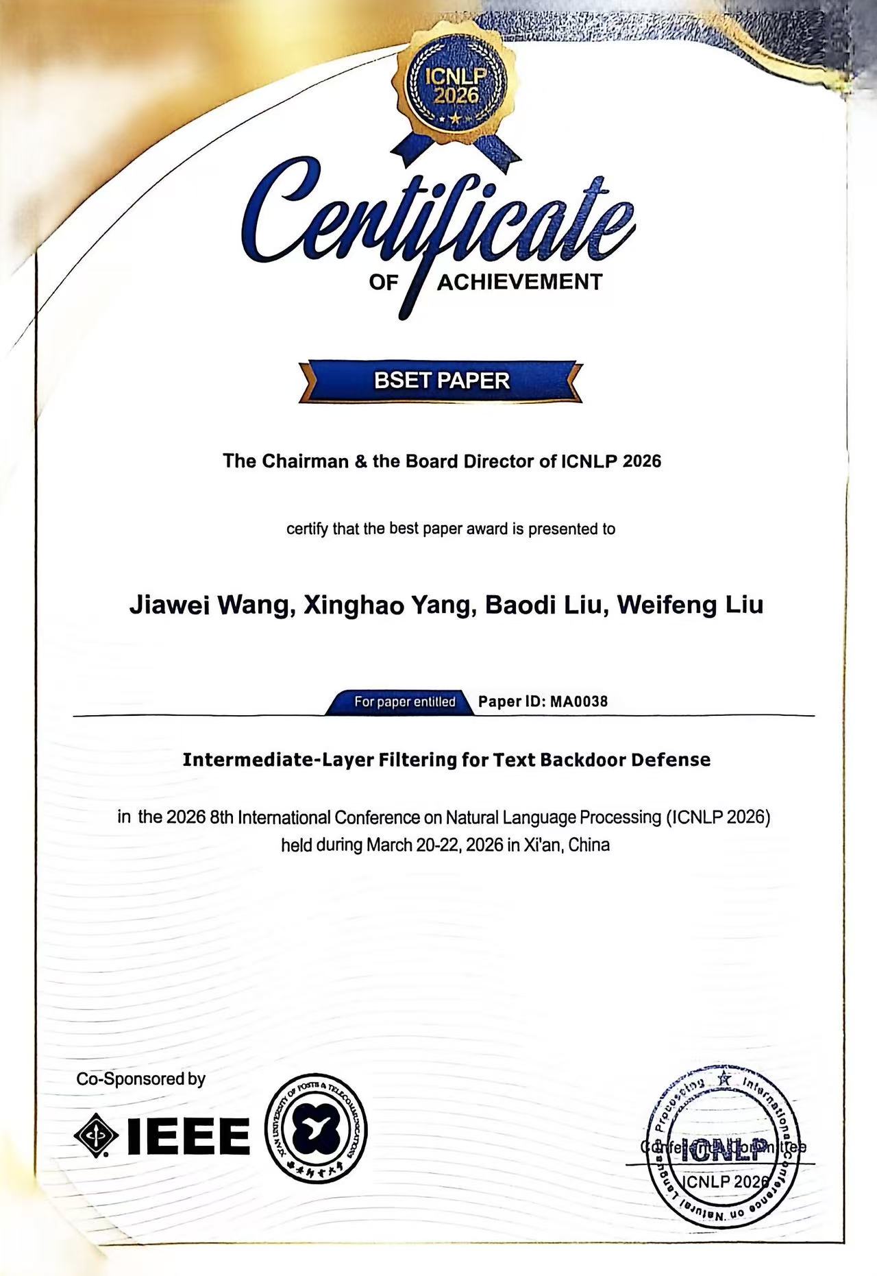 近日,我院刘伟锋教授团队在人工智能领域取得重要进展,相关研究成果《Intermediate-Layer Filtering for Text Backdoor Defense》被ICNLP(International Conference on Natural Language Processing)录用,并获评“最佳论文奖”(best paper)。会议以推动自然语言处理学术创新与技术应用为宗旨,关注理论研究、技术研发及其在教育、医疗、工业、通信等领域的应用。论文第一作者为2024级研究生汪佳玮,通讯作者为杨兴浩副教授,太阳集团tyc234cc为第一署名单位和通讯单位。