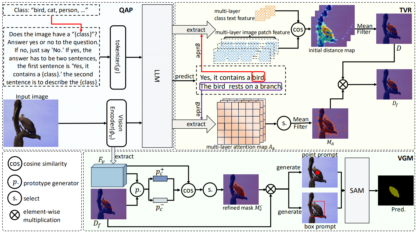 开放词汇语义分割旨在基于文本查询分割图像中的任意对象,可以避免传统方法对预定义类别的依赖。目前的大多数免训练方法依赖于CLIP模型,需要显式定义背景子类,且容易产生全局偏差或错误激活。本研究首次探索了直接利用多模态大语言模型固有的先验知识来完成密集预测任务,并提出了一种全新的FSeg-LLaVA框架。该框架包含三个核心模块:首先是问答流水线模块,用于识别图像中的目标类别并生成文本描述;其次是图文响应模块,用于提取目标类别初始且可靠的像素级激活图;最后是视觉生成模块,通过进一步去除噪声区域以产生可靠的提示,生成最终的预测掩码。实验结果表明,所提方法在不需要提供显式背景类名的前提下就能实现精准分割,显示其处理开放世界复杂场景的巨大潜力。